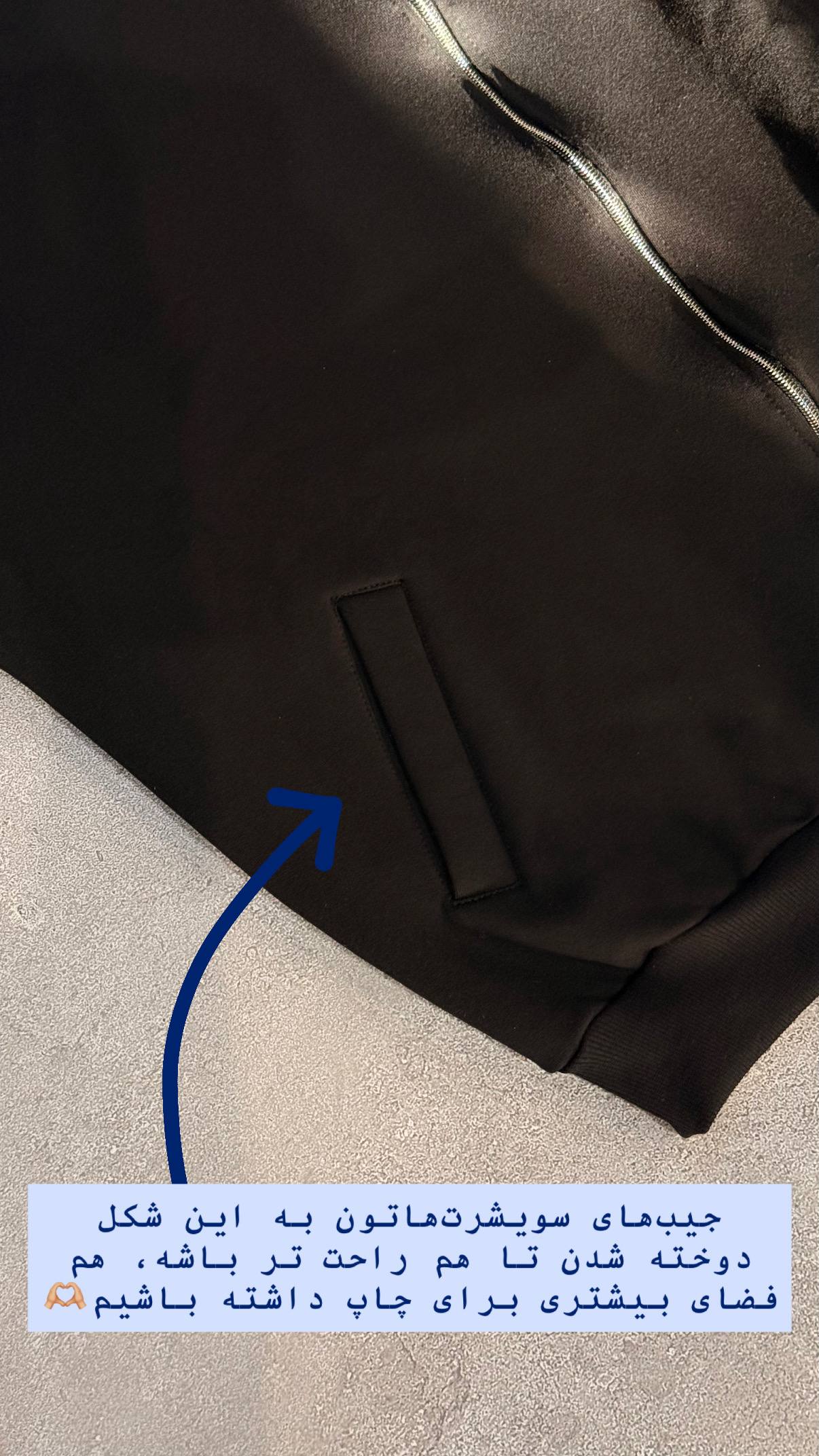 پایین سویشرت و سر آستینها با کشبافت طراحی شدهاند که علاوه بر راحتی، فرم زیباتری به لباس میدهد. همچنین جیبهای فیلتاب آن، فضای بیشتری برای چاپ و طرحهای سفارشی فراهم میکند.